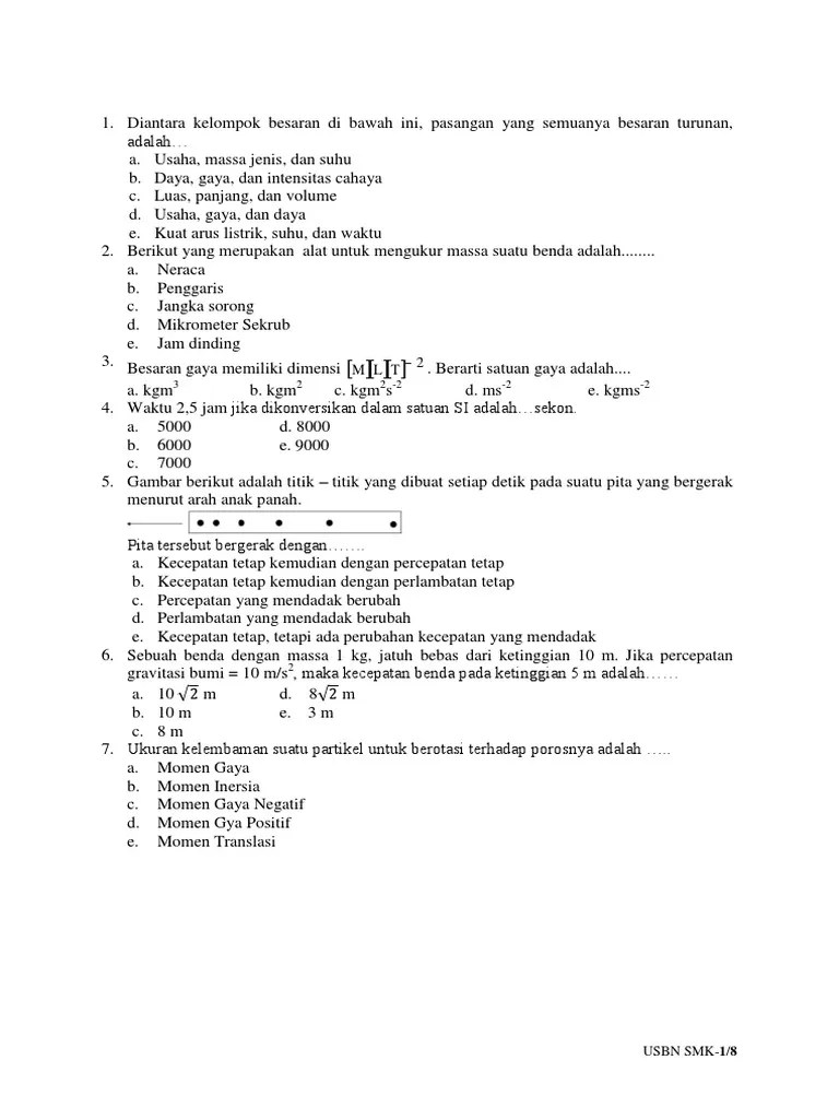 Kumpulan soal dan pembahasan biologi sma400 pembahasan soal . Pilihlah salah satu jawaban yang paling benar. Kisi + kartu soal usbn 2018 fisika uraian.docx. Semoga bisa menjadi bahan belajar untuk . 2013 ujian sekolah berstandar nasional tahun pelajaran 2018/2019 kabupaten/kota. Soal usbn k13 utama.docx from fisika 1234567 at sma negeri 4 bekasi. Bahkan, buku ini menyajikan paket simulasi soal usbn dan un unbk/unkp tahun 2018 serta soal prediksi usbn dan un (unbk/unkp) untuk tahun 2019. Baca lebih lanjut ( 13 halaman). Analisis butir soal, model rasch, penilaian usbn fisika. Soal latihan un dan usbn fisika sma tahun 2018 2019 pendidikan · soal dan jawaban latihan un unbk usbn fisika sma program ipa · naskah soal usbn sma fisika tahun . Fisika pada ujian sekolah berstandar nasional (usbn) siswa smk di siak tahun 2018. Dari suatu sampel unsur radioaktif memiliki tetapan peluruhan 0231/tahun. Soal usbn fisika sma 2017 2018.
